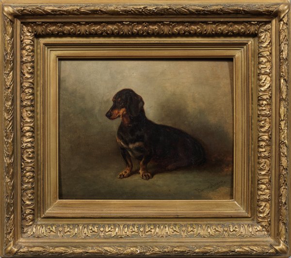 Fein gemaltes, außerordentlich naturgetreues Bildnis des Dackels des Künstlers, den er Waldmann von Bayern genannt haben soll. Der bedeutende Tiermaler Adam, ältester Sohn und Schüler von Albrecht Adam, trat bereits 1835 mit zwei Gemälden hervor. Sein Hauptsujet bildete neben der Darstellung von Haus- und Jagdtieren, Hoch- und Fuchsjagdszenen mit Reitern und Hundemeuten, nicht zuletzt Darstellungen einzelner Hunde und Hundegruppen. Öl/Holzplatte. R. u. sign. 26 cm x 33 cm. Rahmen.