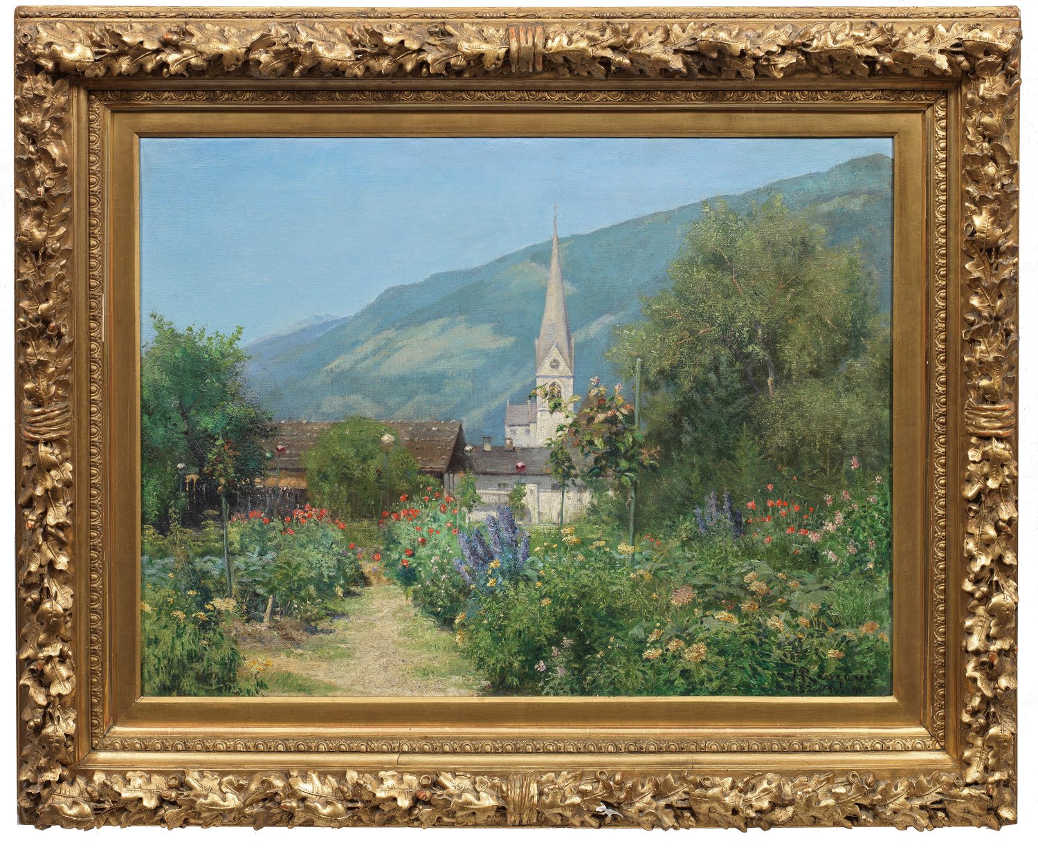 Blühender Garten vor alpenländischer Dorfkulisse und hoch aufragendem Kirchturm. Mit lockerem, pastosem Duktus und in leuchtenden Farben ausgeführtes impressionistisches Werk, das in Stil und Motiv charakteristisch für Ranzonis frühes Oeuvre ist. Ausgebildet an der Wiener Kunstgewerbeschule und den Akademien in Wien und München, schuf Ranzoni Landschafts-, Architektur- und Genrebilder zumeist im Kontext alpenländischer Themen. Öl/Lwd.; R. u. bez. oder sign. sowie undeutlich dat. (18)96. 50,5 cm x 68,5 cm. Rahmen.