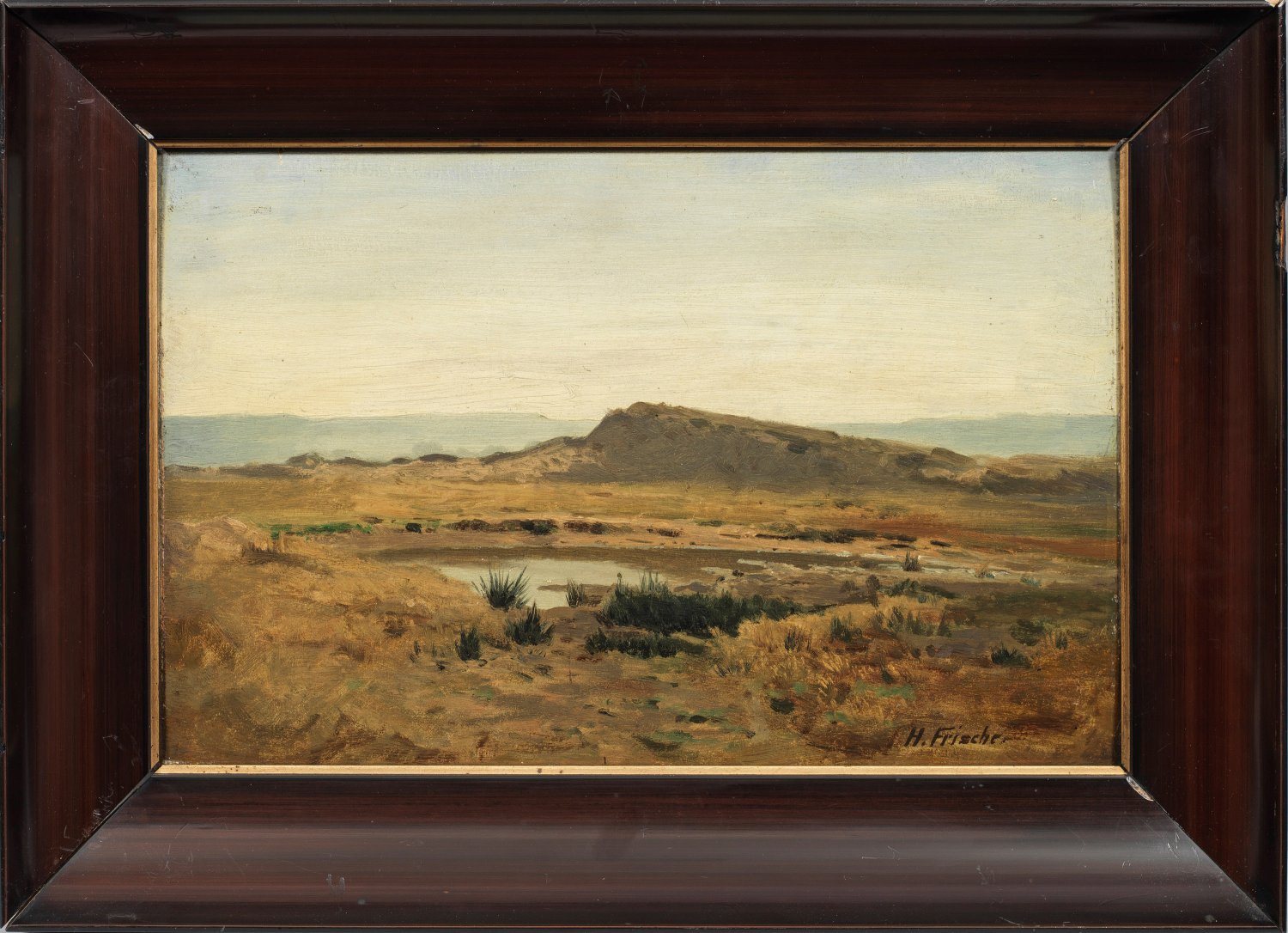 Harmonisch komponierte Darstellung, wohl ein Motiv aus Rannoch Moor. Frische studierte 1858-1862 bei Hans Gude an der Düsseldorfer Kunstakademie und beteiligte sich seitdem an zahlreichen Ausstellungen in vielen deutschen Städten. Öl/Holztafel. L. u. sign.; 24,5 cm x 39,2 cm. Rahmen.