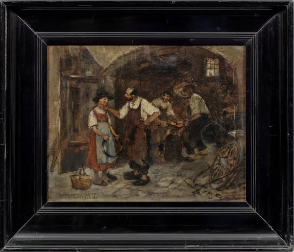Frühes Genrebild des Malers, der in München bei Otto Seitz und Franz von Defregger lernte und dort längere Zeit ansässig war. Öl/Malkarton. L. u. sign. u. dat. (18)87 mit Ortsangabe München. 30,5 cm x 38 cm. Rahmen.