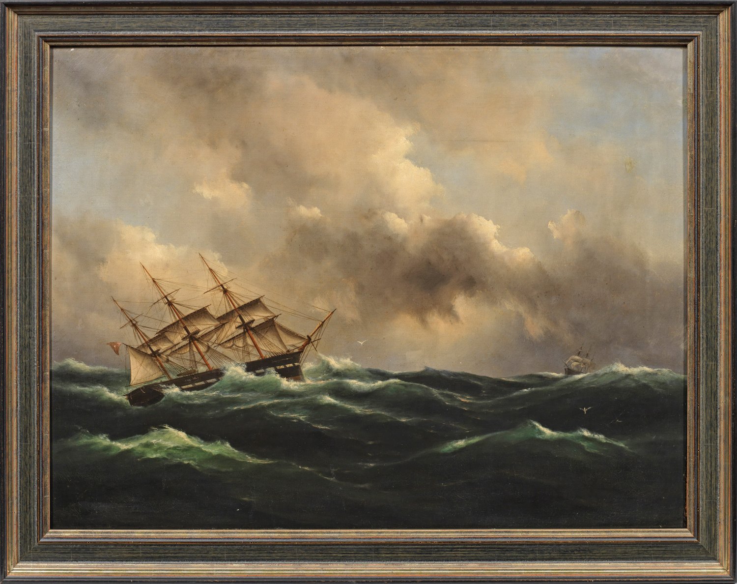 Unter dramatisch in Szene gesetztem Wolkenhimmel der Dreimaster auf tosender See, am Horizont ein weiterer Segler. In Sujet und besonders in der atmosphärischen Lichtführung charakteristisches Seestück des holländischen Marinemalers, der bei P. Hofmann und Schotel studierte und 1862 in Hamburg ansässig wurde. Öl/Lwd., doubliert auf Holztafel. L. u. sign.; Rest.; 72 cm x 95,5 cm. Rahmen.
