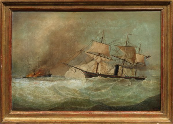 Auf wogenden Wellen dramatisch inszenierte Darstellung der Korvette Augusta unter der Kriegsflagge des Norddeutschen Bundes beim Versenken eines französischen Schiffes im Golf von Biskaya am 4. Januar 1871. Bürklein, der bei Emil Kirchner und Joseph Weiß studierte, schilderte in diesem Werk eine Episode des Deutsch-Französischen Kreuzerkrieges, die u.a. auch von Alexander Kircher und Christopher Rave aufgegriffen wurde. Öl/Lwd.; R. u. sign.; Verso auf altem Papieretikett schwer leserlich bez.; Craquelée, nachgedunkelt. 35 cm x 52,5 cm. Rahmen.