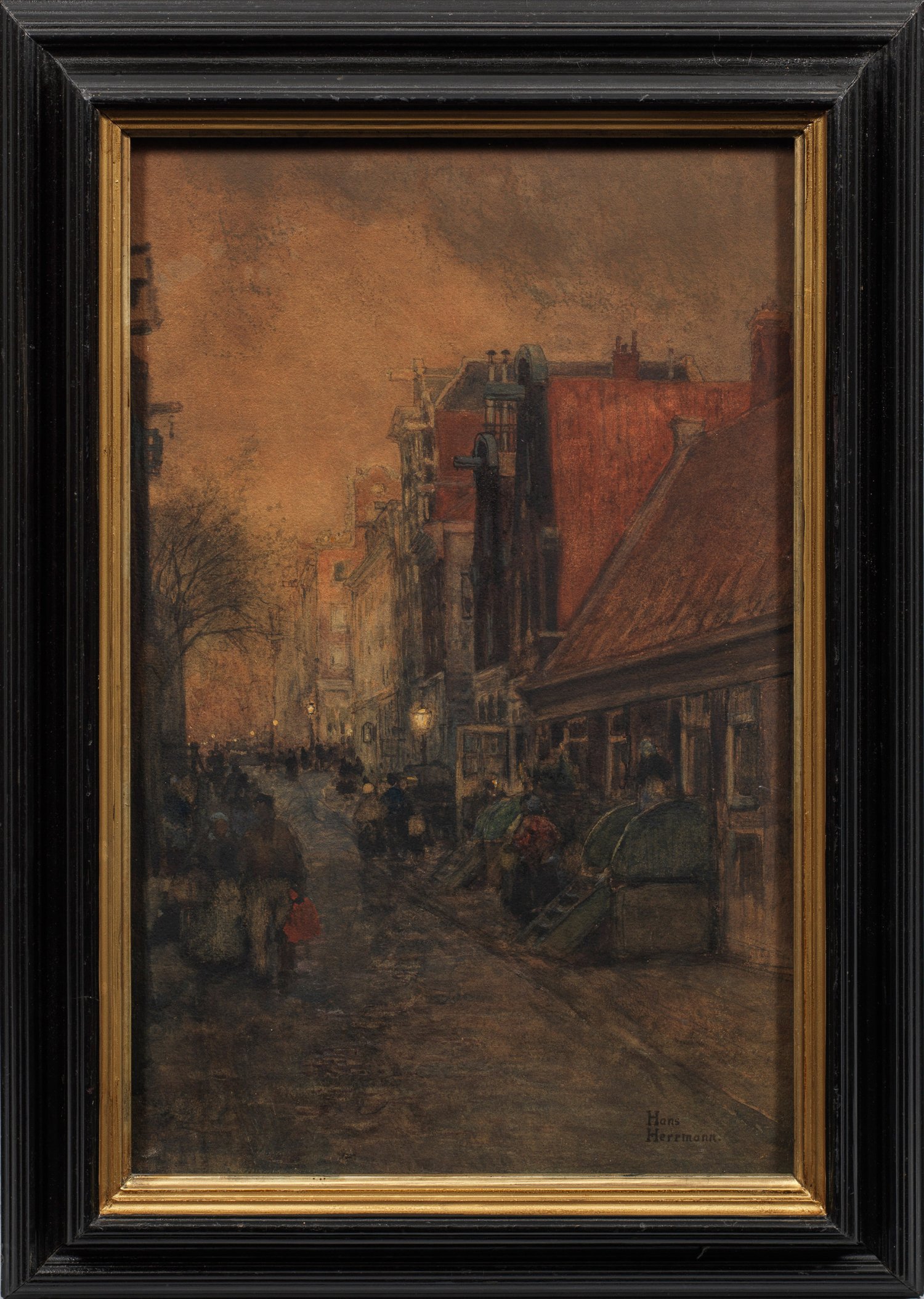 Impressionistische Stadtansicht, wohl aus Amsterdam oder Dordrecht. Nach seinem Malereistudium an den Akademien von Berlin und Düsseldorf, wo Herrmann u.a. bei Eugen Dücker studierte, kehrte er 1886 nach Berlin zurück. Zu seinen beliebtesten Bildsujets zählen holländische Stadtansichten, Fisch- und Blumenmärkte. Mischtechnik/Karton. R. u. sign.; 48 cm x 32 cm. Rahmen.