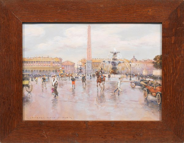 Impressionistische, in pastellfarbenem Kolorit gemalte, atmosphärische Parisansicht in der Zeit der Jahrhundertwende. In Stil und Sujet repräsentatives Werk im Oeuvre Steins, der Schüler bei Jules Lefebvre ud Gustave Boulanger war und sich auf belebte, lichtdurchflutete Stadtansichten spezialisierte. 1906 stellte er im Salon des Indépendants und 1912 - 1914 im Salon des Artistes Français aus. Aquarell und Bleistift/Bütten. L. u. sign. und mit Ortsangabe Paris. Blatt 27,9 cm x 37,4 cm. Rahmen.