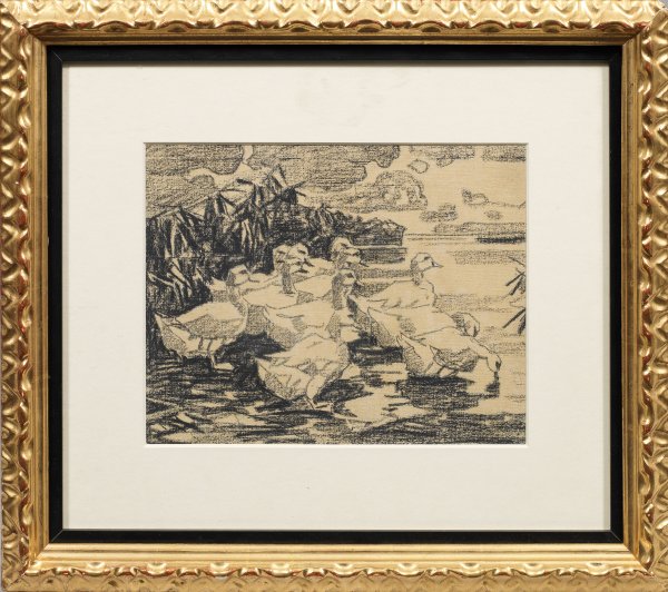 Für Koester, der an der Karlsruher Akademie studierte, wurden Enten ab 1898 zu seinem wichtigsten Studienobjekt und Motiv, das ihn in einer großen Variationsbreite zeitlebens intensiv beschäftigte. Kohlestift und blauer Buntstift/Lwd. (ohne Keilrahmen); Verso Nachlassstempel "Aus dem Nachlaß des Kunstmalers A. Koester Dieseen a./A.". 21,3 cm x 27,4 cm. Rahmen.