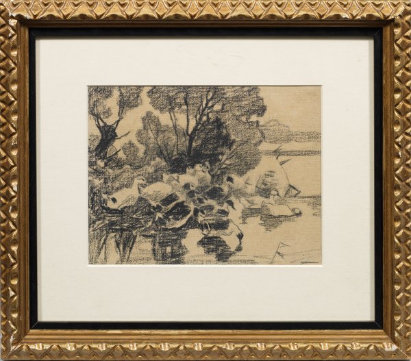 Für Koester, der an der Karlsruher Akademie studierte, wurden Enten ab 1898 zu seinem wichtigsten Studienobjekt und Motiv, das ihn in einer großen Variationsbreite zeitlebens intensiv beschäftigte. Kohlestift und blauer Buntstift/Lwd. (ohne Keilrahmen); Verso Nachlassstempel "Aus dem Nachlaß des Kunstmalers A. Koester Dieseen a./A.". 20,6 cm x 27,7 cm. Rahmen.