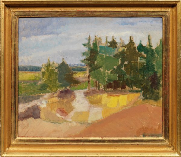 Farbintensive, kraftvoll gemalte Landschaftsstudie in zur Abstraktion strebender Formensprache. Öl/Malkarton. R. u. sign. u. dat. 1934. L. u. ortsbez. "Vaensor Lüneb. Heide" u. dat. 1934. Verso zusätzlich ortsbez.; Ca. 35 cm x 43 cm. Rahmen.