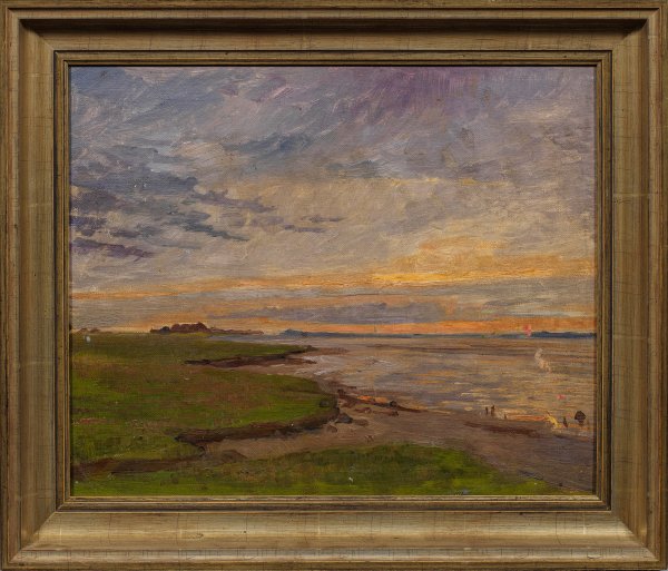 In sanftes, warmes Abendlicht getauchte, mit lockerem Duktus ausgeführte Wattküstenansicht der bekannten Hamburger Künstlerin, belebt durch am Ufer spazierende Personen. Öl/Lwd., kaschiert auf Platte. Verso Nachlassstempel. Stellenweise ger. Farbverluste und Retuschen. Ca. 34,5 cm x 42,5 cm. Rahmen.