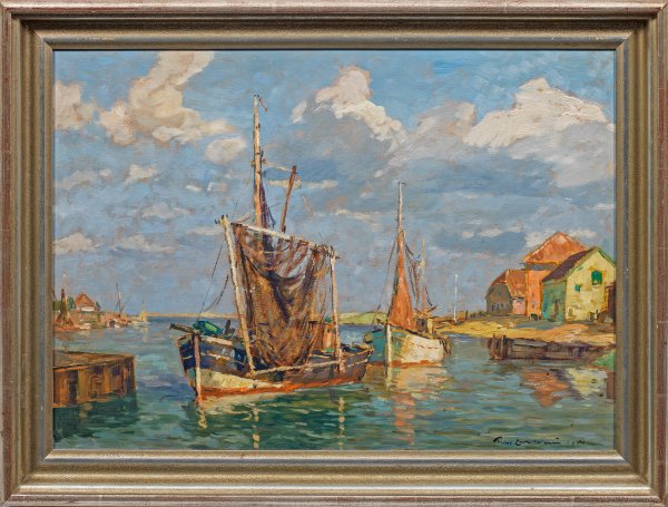 Für Wilke charakteristische Hafenansicht, gemalt in warmen, pastelltonigen Farben und breitem, lockerem Duktus. Öl/Masonitplatte. R. u. sign. und dat. 1951. Ca. 50 cm x 70 cm. Rahmen.