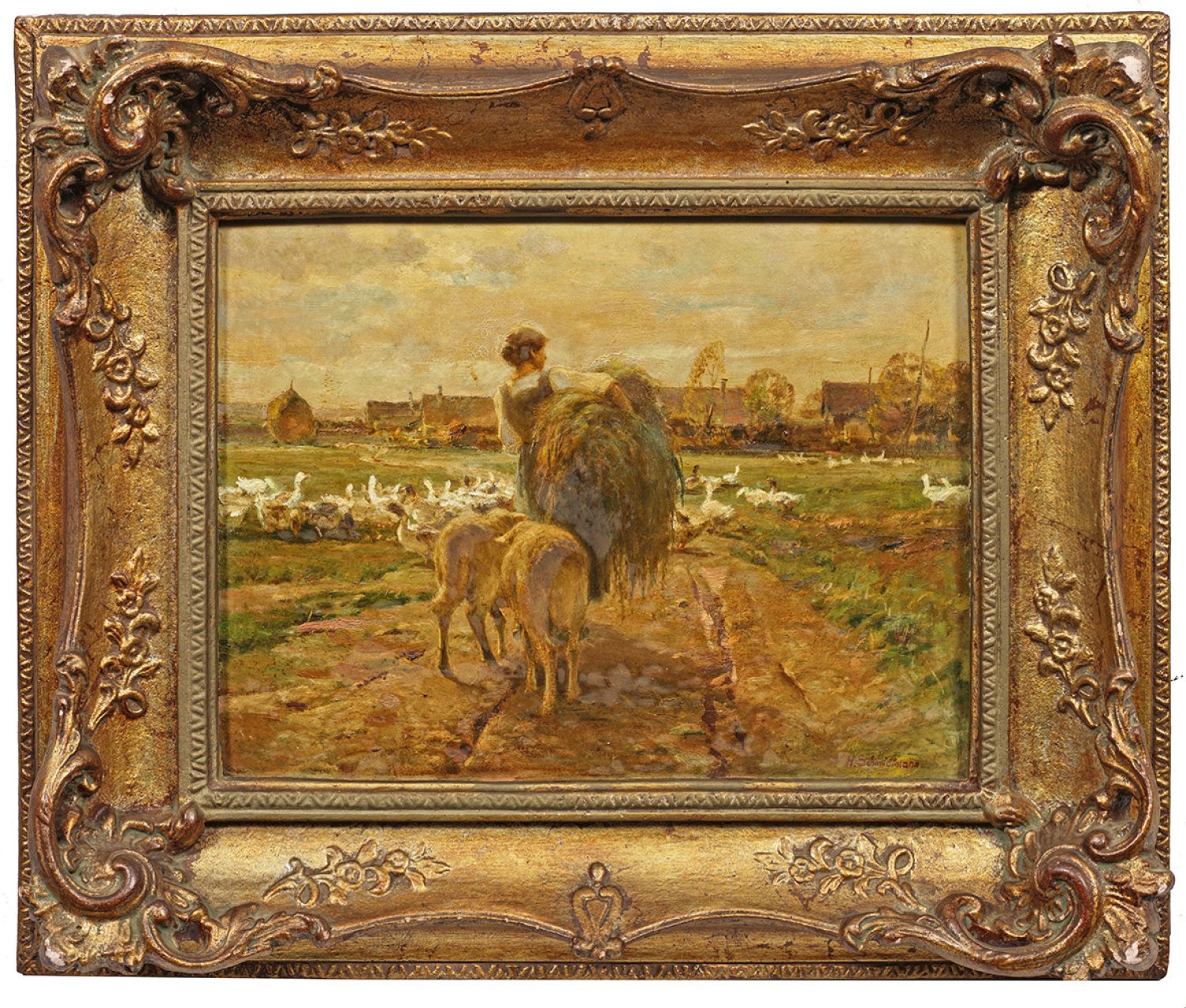 Charakteristische, in warmes Abendlicht getauchte Landwirtschaftsvedute einer jungen Frau, Heu nach Hause tragend und damit zwei Schafe mit sich lockend. Im Hintergrund eine Schar Gänse vor einem Dorf. Öl/Hartfaserplatte, r. u. sign.; 30 cm x 40 cm. Rahmen.