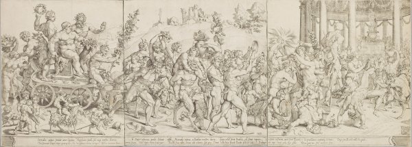 Uneinigkeit herrscht über die Quelle dieser Komposition. Sune Schéle vermutet, dass die Komposition auf einer Zeichnung von Marten van Heemskerk (1498-1574) basiert, während Stefania Massari nahelegt, dass die Komposition ursprünglich von Giulio Romano (c.1499-1546) stammt, inspiriert von einem Flachrelief im Palazzo del Te.