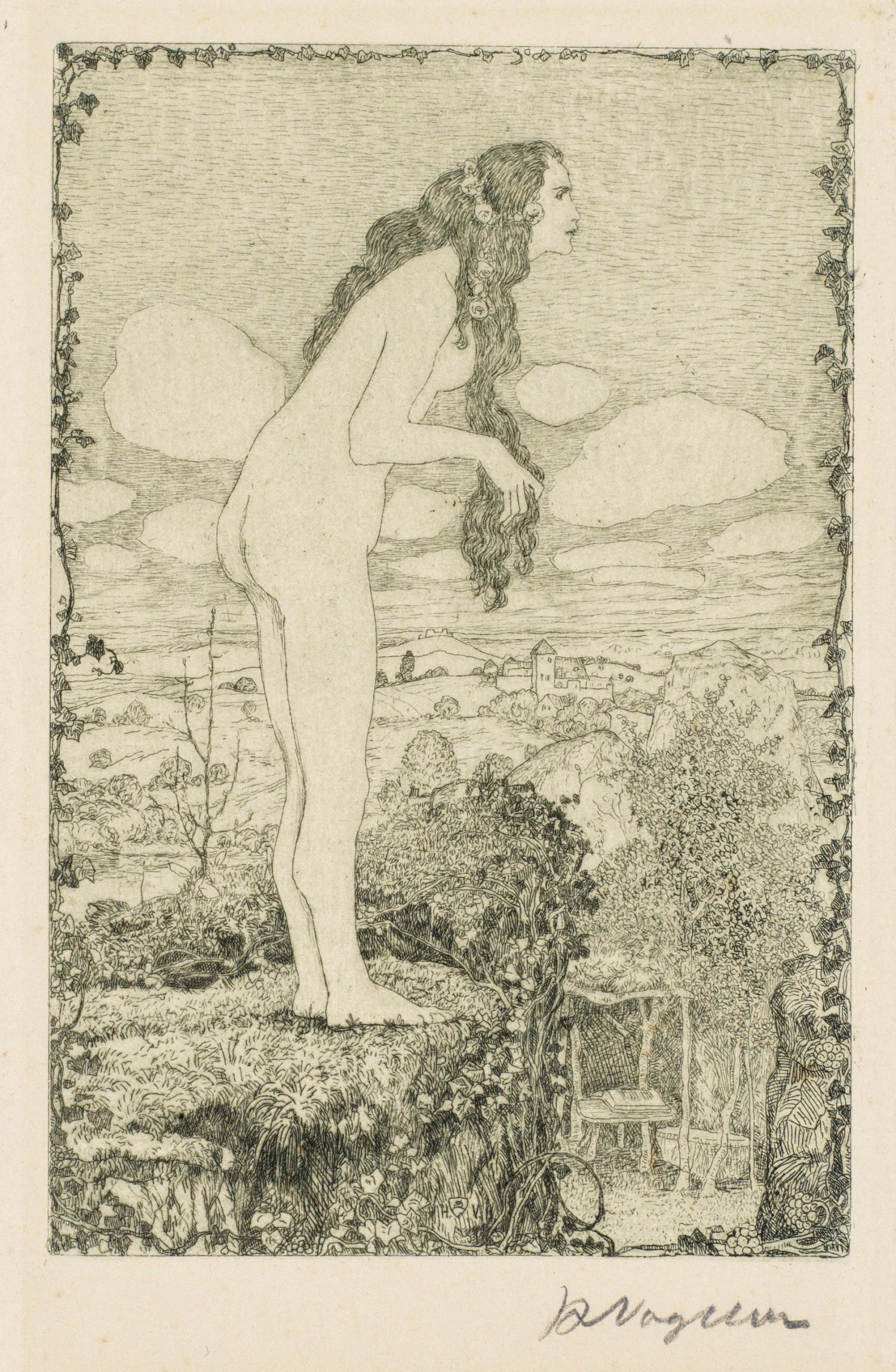 Radierung in Grün/Bütten, 1907. R. u. sign. sowie in der Platte monogr. mit Worpsweder Wappenschild. Verso betitelt, dat. und mehrfach bez.; Wvz. Rief 41 IIc. Leicht fleckig und lichtrandig. Platte 13,5 cm x 8,5 cm. Blatt 31,5 cm x 22,5 cm.