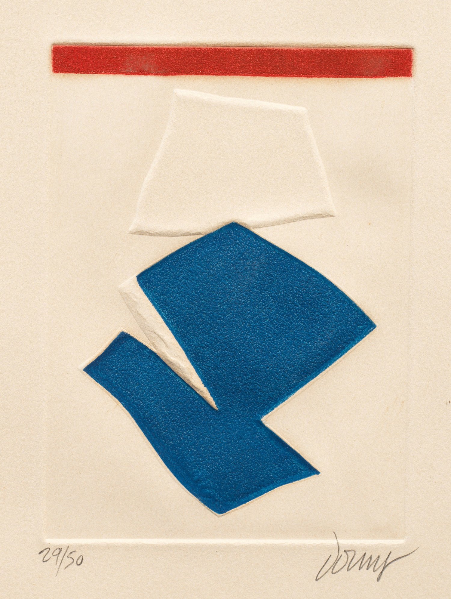 Farbaquatinta und Prägedruck/Bütten, 1972. Im Unterrand sign. und nummeriert 29/50. L. u. Blindstempel "Orangerie Cologne". Aus der Folge "Proposition pour un mouvement de formes". Stellenweise gebräunt. Platte 18,8 cm x 13,5 cm. Blatt 37,8 cm x 28 cm. Rahmen.