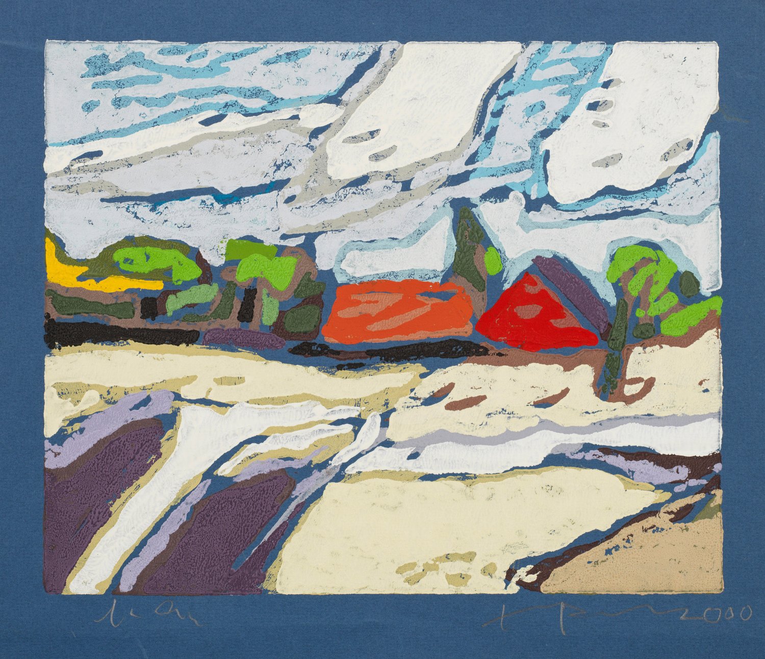 Linocut in colours on blue paper. Signed, dated 2000 and inscribed "e.a." (artist's proof).
