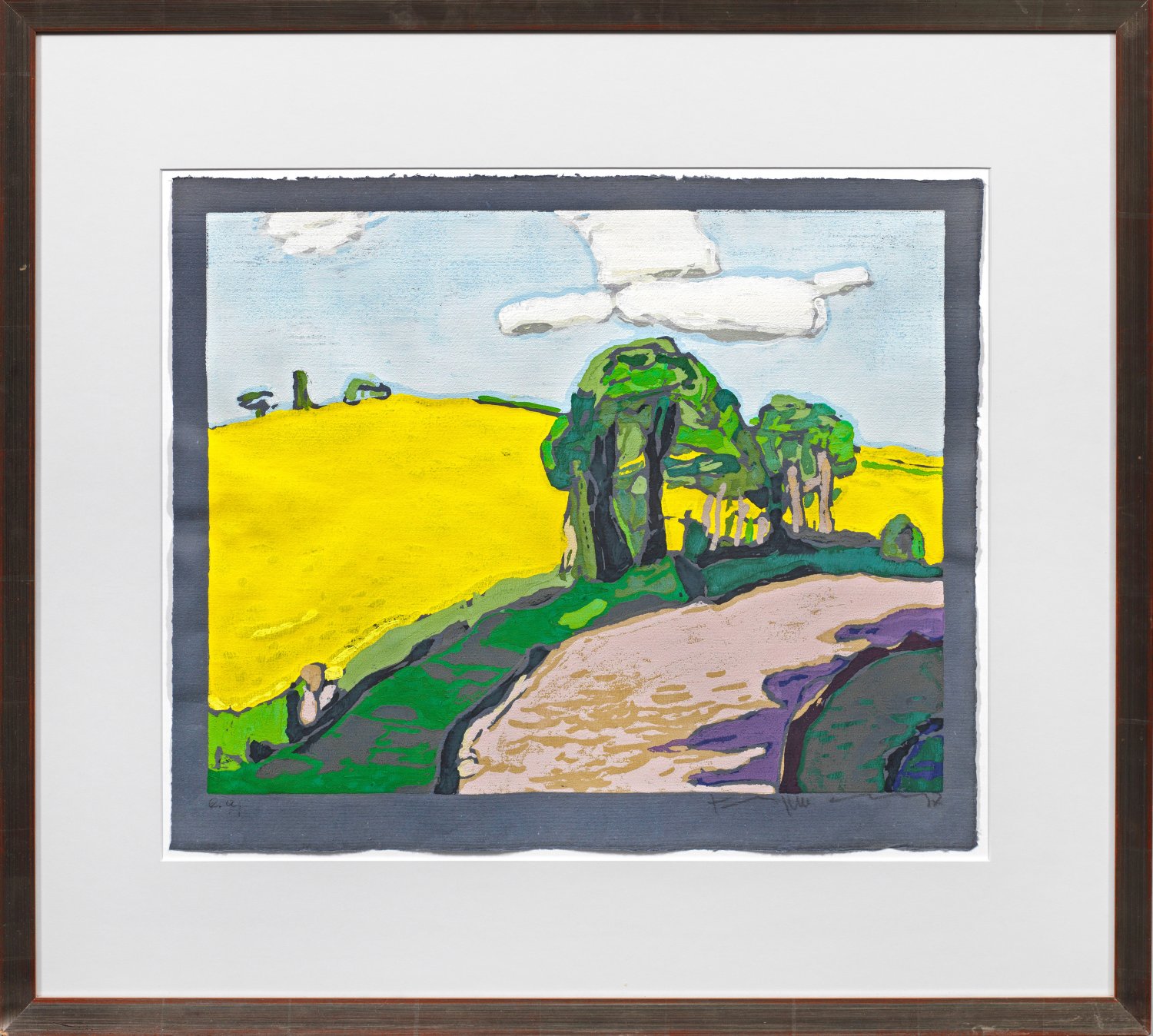 Farblinolschnitt/graues Bütten. Sign., dat. (19)97 und als Künstlerexemplar "e.a." bez.; Stark flächig komponierte Landschaft Fußmanns, der von Berlin und Gelting aus Studienreisen durch ganz Deutschland unternimmt, um die verschiedenen Landschaftsreize festzuhalten. Darstellung 42 cm x 54 cm. Blatt 49 cm x 59 cm. Rahmen.