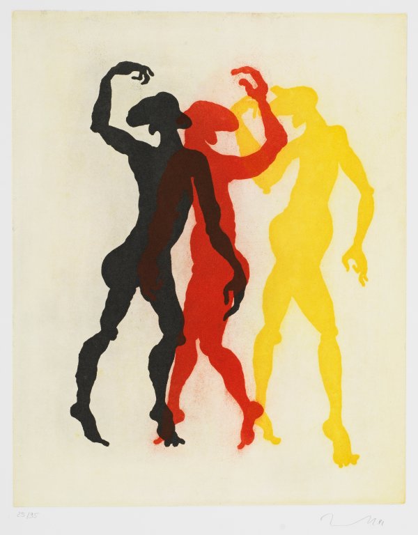 Ohne Titel (Drei tanzende Figuren in Schwarz, Rot, Gold)