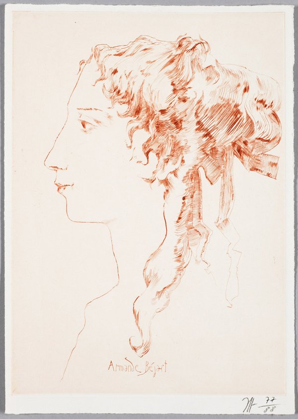 Kaltnadel in Rotbraun/gewalztes Velin, 1977/88. Sign. u. dat.; Gesamtauflage 525 Exemplare. Wvz. Frielinghaus 1977/6. Abzug 1988 von Frielinghaus als lose Beilage zur Vorzugsausgabe des von Dierk Lemcke herausgegebenen Janssen-Buches "Frauenbildnisse", Hamburg 1988. Prachtvoller, gratiger Druck mit dem vollen, schmalen Rand. Plattenmaß ca. 30,5 cm x 22 cm; Blatt 33 cm x 23,2 cm.