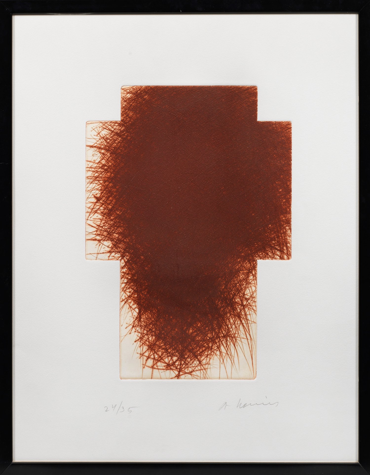 Kaltnadelradierung auf Zink in Rotbraun/Bütten, 1990. Im Unterrand sign. u. num. Ex. 24/35. Das Kreuz als Form, Zeichen und gestalterisches Prinzip erscheint in allen Schaffensperioden Rainers, und wurde auch, wie in diesem Blatt, selbst zum Bildinhalt als solches. Hierbei ist das Motiv des Kreuzes nicht als Ausdruck von Rainers Spiritualität zu lesen, sondern gilt ihm vielmehr als Ausdruck einer spirituellen Not und Dürre, wie er es selbst beschreibt. Platte 41,5 cm x 29,5 cm. Blatt ca. 50 cm x 64,5 cm. Rahmen.