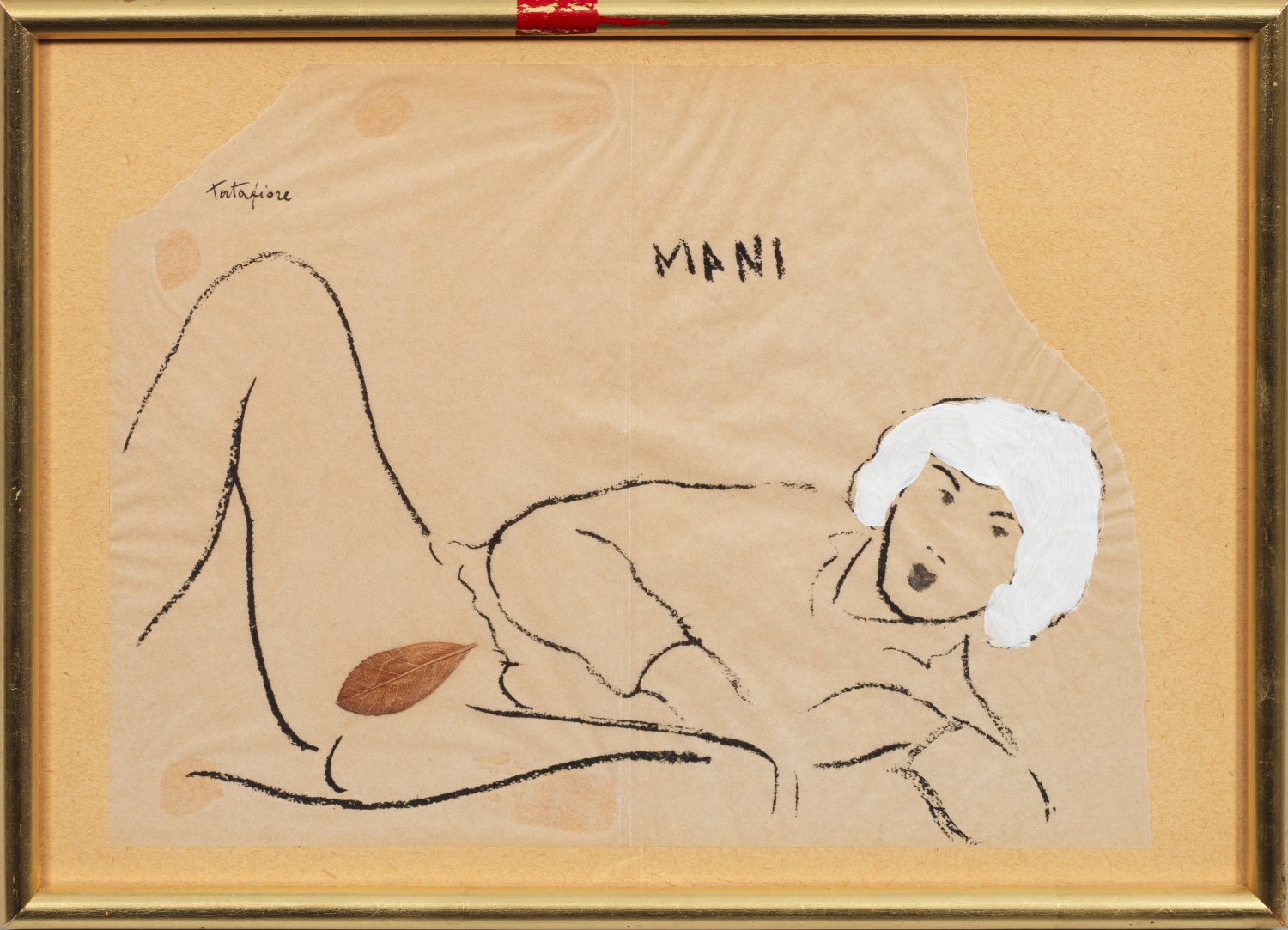 Collagierte, kolorierte (Deckweiß) Lithographie/bräunliches Transparentpapier. Im Stein sign. u. betitelt. Liegender, weiblicher Halbakt ausgeführt als Kombination unterschiedlicher Techniken und Materialien und somit charakteristisch für das Oeuvre Tatafiores, das zunächst zwischen Konzeptkunst und Arte Povera changierte. Montierungsstellen durchschlagend. Ca. 19 cm x 25 cm. Rahmen.