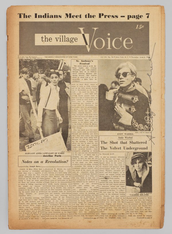 Ausgabe der Zeitung "The Village Voice" vom 6. Juni 1968 (bestehend aus 10 Doppelseiten). Auf der Titelseite ist ein Bericht über den Mordversuch an Andy Warhol durch Valerie Solanas am 3. Juni 1968. Titelblatt auf Höhe eines Fotos von Andy Warhol am rechten Rand gestürzt mit schwarzem Faserstift sign.; Normale altersbedingte Läsuren u. Verfärbungen. 42 cm x 29 cm.