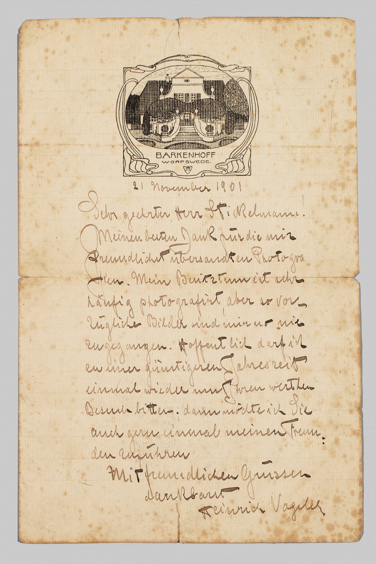 Signed autograph letter by Heinrich Vogeler to the photographer Rudolph Stickelmann (1870 - 1956), dated 1901. Minor flaws and foxing.