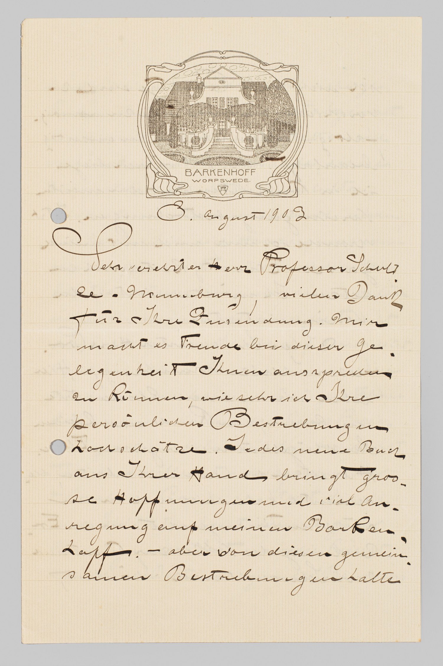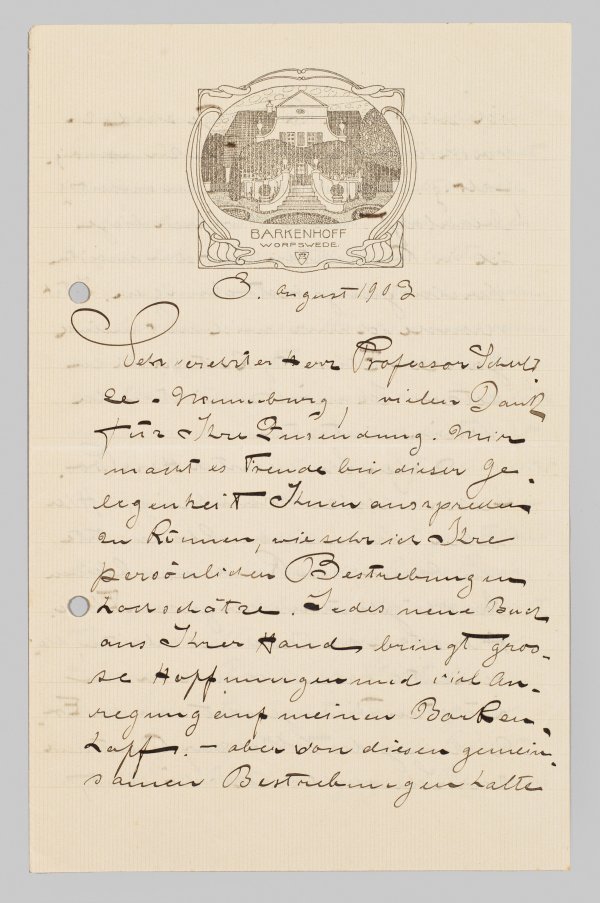 Vierseitiger, eigenhändiger Brief (auf gefaltetem Doppelbogen) mit "Barkenhof"-Briefkopf u. Unterschrift, dat. 3. August 1902. Ger. knickfaltig. Später gelocht. 21,8 cm x 14 cm bzw. 28,1 cm.
