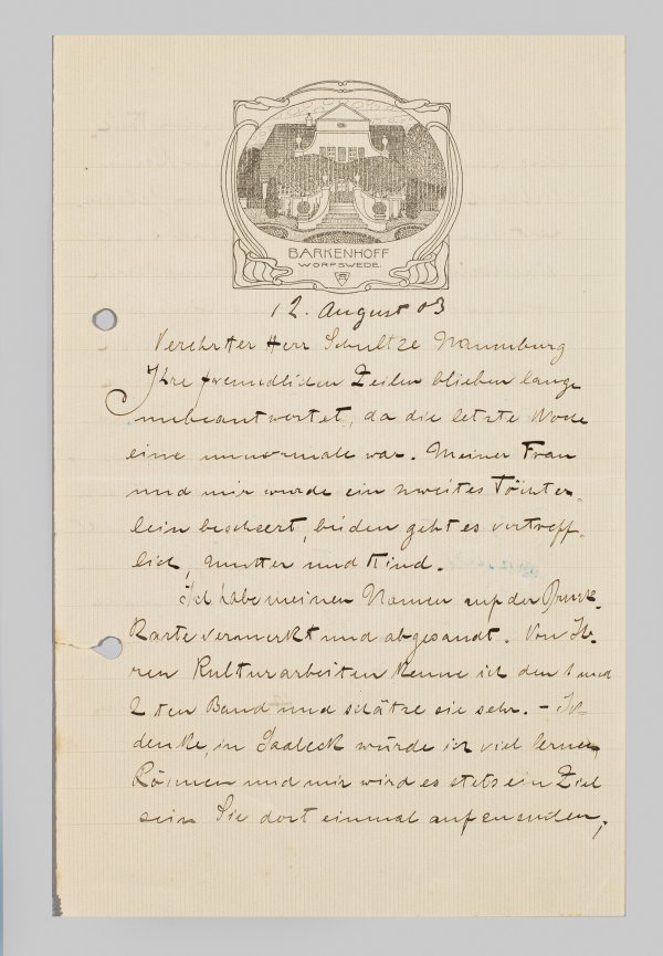 Zweiseitiger, eigenhändiger Brief mit "Barkenhof"-Briefkopf u. Unterschrift, dat. 12. August (19)03. Ger. knickfaltig, kl. Einriss. Später gelocht. 21,8 cm x 14,1 cm.