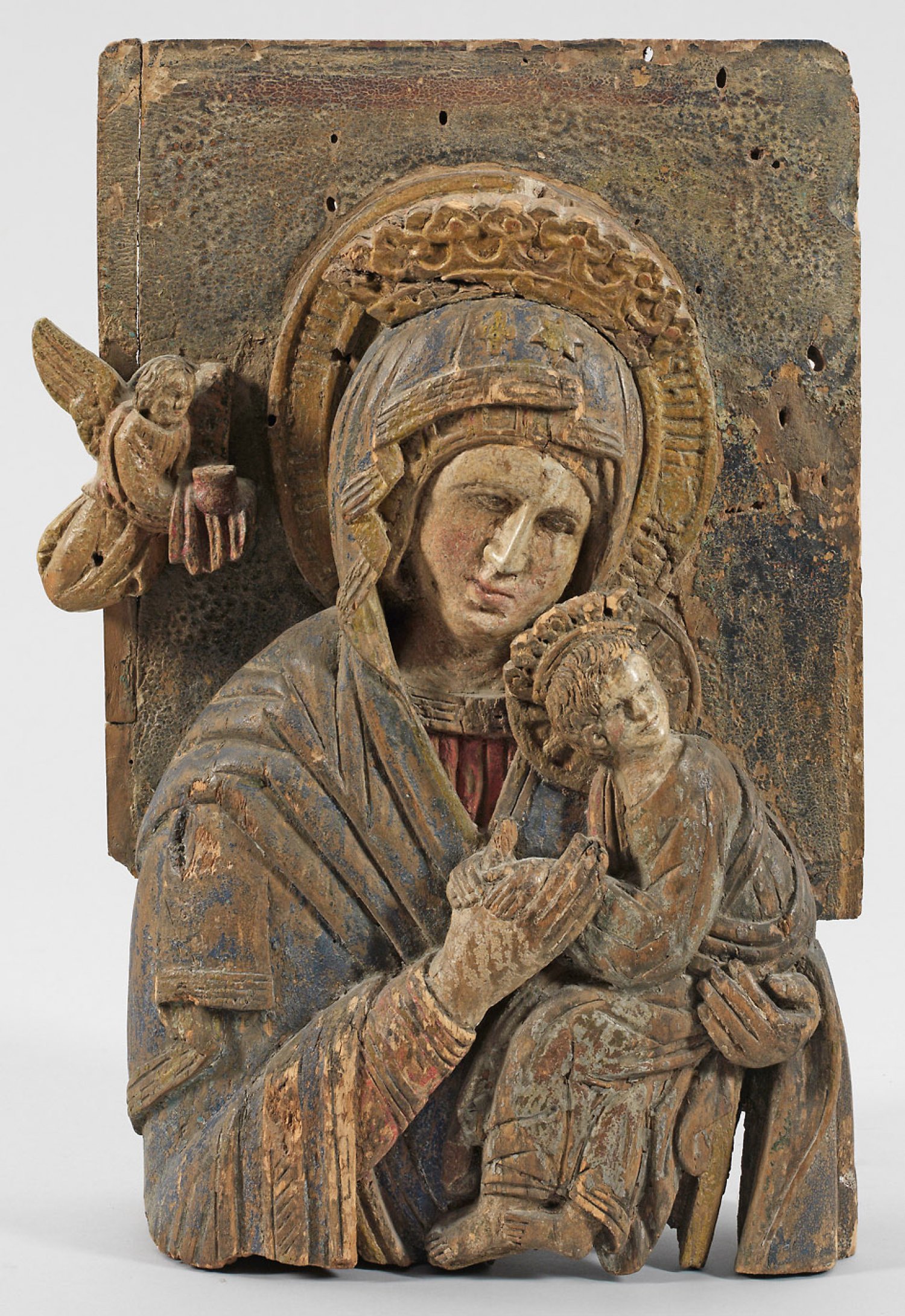 Holz, geschnitzt, Reste alter Fassung und Vergoldung. Reliefplastische Darstellung der Muttergottes mit Kind sowie eines schwebenden Engels mit Leidenswerkzeug. Seltene Devotionalskulptur für Wallfahrer nach der byzantinischen Gnadenbild-Ikone aus dem 14. Jh., die um 1499 in der St. Matthäus-Kirche in Rom aufgestellt wurde. Rechter Engel verloren. 55 cm x 36 cm x 13 cm.