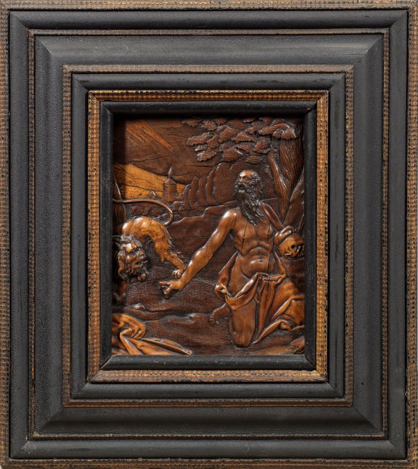 Geschnitzte Reliefintarsien-Bildtafel aus unterschiedlichen Hölzern. Szenische Darstellung des knienden, büßenden Hieronymus als Halbakt mit einem Schädel in einer baumbestandenen Landschaft, auf der linken Bildseite ein Löwe als sein Attribut, im Hintergrund eine Burg bzw. befestigte Stadt. Die künstlerisch meisterhafte, als separate Bildplatte konzipierte, um 1650 entstandene Tafel diente als privates Andachtsbild oder als reines Kunstkammerobjekt. Sowohl die Landschaft als auch die Figuren des Löwen und insbesondere des Hieronymus mit seinem anatomisch wiedergegebenen Körper und charaktervollen Kopf verweisen auf ein Werk Adam Ecks. Von diesem ist eine in Hieronymus-Figur vergleichbare Bildtafel bekannt, die sich in Privatbesitz befindet. Adam Eck führte nicht nur Mitte der 1620er Jahre die Kunst der Reliefintarsien ein, sondern ist auch der bedeutendste Meister dieser Kunst, die erst um 1740 endete. In Ecks Werkstatt und zahlreichen florierenden Werkstätten nach ihm entstanden Spielbretter, Kabinettschränke, Schatullen, Kästchen und Einzelbilder, die als begehrte Kunstkammerobjekte und Geschenke an Adelshöfe und vermögende Connaisseurs in Europa gingen. 28,5 cm x 23,2 cm. Wohl Original-Rahmen.