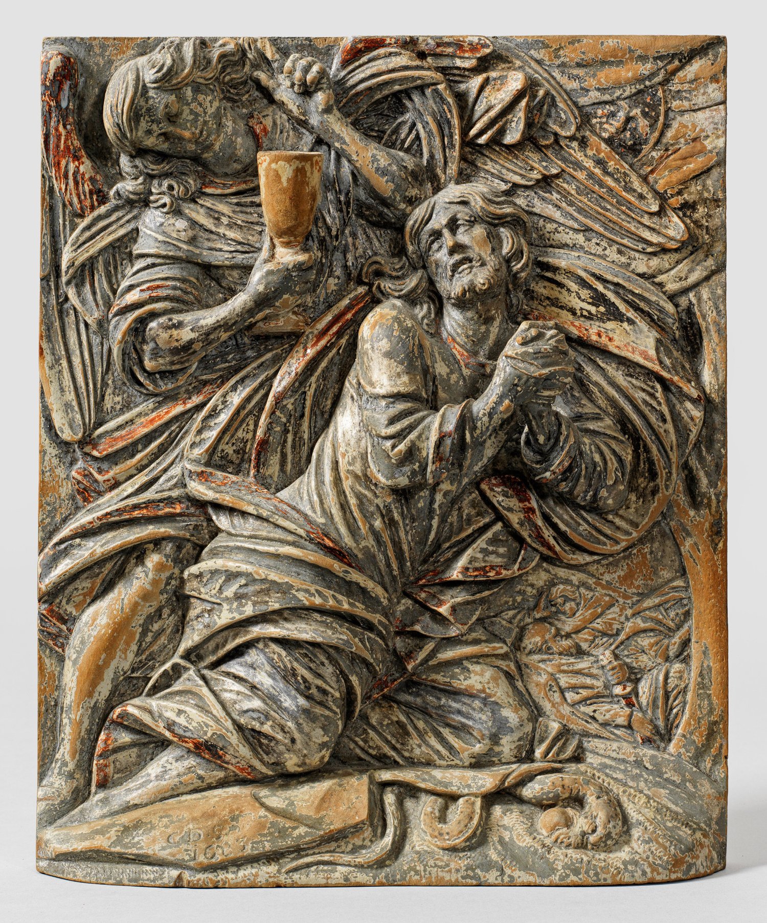 Lindenholz, geschnitzt; Ursprüngliche Silberfassung und Vergoldung mit silberfarbenem Grau überfasst und teilw. bis auf den Bolus, die Grundierung und das Holz durchgerieben. Unter dem rechten Bein Christi monogr. "CD.S.", darunter dat "1683". Szenische Darstellung nach dem Lukas-Evangelium (Lukas 22, 39-46) mit dem knienden Christus, der die Hände angstvoll zum Gebet gefaltet hat und sich zu einem großen, hinter ihm stehenden Engel umdreht. Dieser hält in der Nacht vor der Kreuzigung den Kelch des künftigen Leidens in der Hand, stärkt Christus und deutet mit der linken Hand zum Himmel, denn Christus wendet sich in großer Angst an Gottvater und fleht ihn an: "Vater, lass diesen Kelch an mir vorübergehen". Mit seinem linken Knie drückt Christus parallel hierzu die Schlange des Paradieses mit dem Apfel nieder, das ihn ikonographisch bzw. theologisch als Gegenstück zu Adam für die Menschheit zum Überwinder des Bösen und der Erbsünde werden lässt. Im Hintergrund rechts unten Petrus und zwei weitere schlafende Jünger; rechts oben der hinter Wolken hervorscheinende Mond. Laut Dr. Fritz Fischer ist das "meisterhaft geschnitzte Relief (...) ohne jeden Zweifel ein eigenhändiges Werk von Christoph Daniel Schenck. Seine unverwechselbare Handschrift zeigt sich vor allem in der Wiedergabe der Gewänder (...): eine Demonstration virtuoser Schnitzkunst". Ebenso charakteristisch für den Bildhauer ist die komprimierte Kompositionsweise des Reliefs. Schenck war einer der ersten hochbarocken Bildhauer in Süddeutschland sowie der Schweiz und prägte die Geschichte der Skulptur in diesem Raum. Er arbeitete fast ausschließlich für den Fürstbischof von Konstanz und den Fürstabt von Einsiedeln, damals die ranghöchsten kirchlichen Auftraggeber Südwestdeutschlands und der Schweiz. Möglicherweise stammt das Relief, wie die meisten seiner Werke, ursprünglich aus dem Kloster Einsiedeln und fungierte dort, ehedem kostbar gerahmt, als eines der zahlreichen Andachtsbilder für die Gläubigen, die im 17. Jh. in den berühmten Wallfahrtsort pilgerten. Ein gut vergleichbares Relief gleichen Themas befindet sich in der katholischen Pfarrkirche St. Martin in Ittendorf (vgl. Kat. "Christoph Daniel Schenck 1633-1691", Sigmaringen 1996, Kat. Nr. 11). 28,5 cm x 23,5 cm x 5 cm.