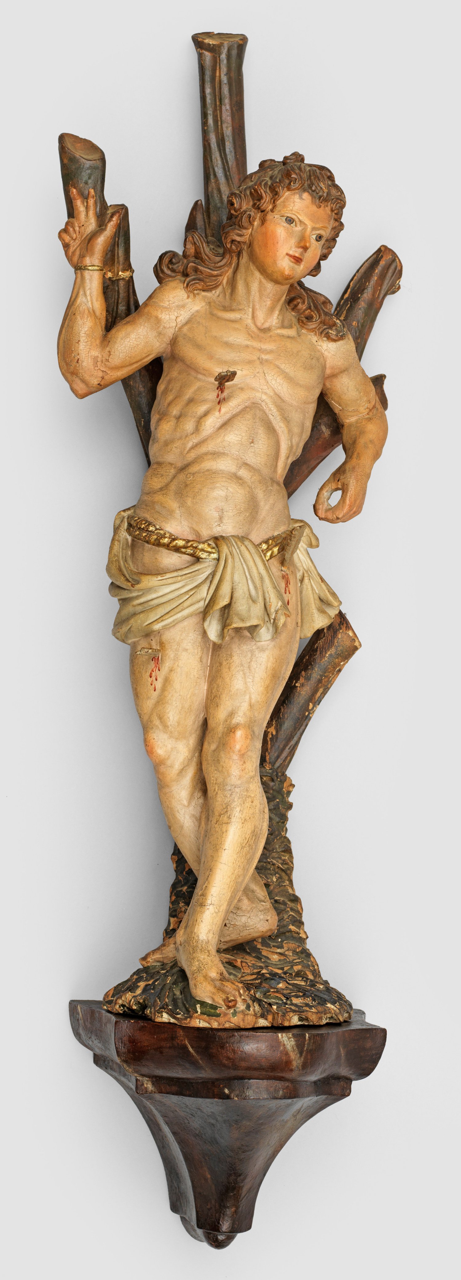 Lindenholz, geschnitzt; wohl alte oder originale Fassung. Vollplastische Statuette des an einem Baum gefesselten, von drei Pfeilen in der Brust und in den Oberschenkeln getroffenen Märtyrerheiligen, der Schutzpatron gegen die Pest und Seuchen sowie der Soldaten, Schützenbruderschaften und vieler anderer Gruppen war. Geschildert wird er in dieser Skulptur als Jüngling mit nach links geneigtem Kopf, sehr lang auf die Schulter fallendem, gewelltem Haar und um die Hüften mit einem Tau gegürteten Lendentuch. Rücks. ansteigende, stark mit Bodenrelief geschnitzte Plinthe, oberhalb in den Baum übergehend. Künstlerisch herausragend ist der Hl. Sebastian als Halbakt in seiner ganzen, idealisierten, maskulinen, athletischen Schönheit und Lebendigkeit mit klar definierter, anatomisch getreuer Muskulatur dargestellt, die Füße in diagonaler Stellung voreinander gesetzt. Der triumphale Gestus der rechten, erhobenen Hand lässt ihn im Zuge der Gegenreformation auch zu einem ruhmreichen Kämpfer des Glaubens werden, dem keine Tortur etwas anhaben kann, wodurch die durchaus immanente lasziv-erotische Wirkung seines Körpers in den Hintergrund treten soll. Ger. besch.; H. 86,5 cm.