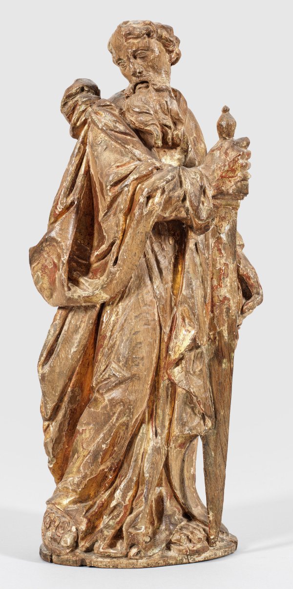 Eichenholz, geschnitzt, Reste alter Fassung und Vergoldung. Annähernd vollplastische, rücks. leicht abgeflachte Darstellung des Apostels in einem bodenlangen Gewand und auf der rechten Schulter geknoteten Mantel. Auf einer ovalen Plinthe in schreitender Pose stehend, zugleich mit der rechten Hand ein großes Schwert (Bidenhänder) als Attribut haltend und sich mit dem vollbärtigen Kopf nach rechts hinten umdrehend. Die hochbarocke Skulptur verbindet Kompaktheit mit einer kraftvollen Dynamik und Ausdruckskraft, die nicht nur durch die Drehbewegung und die Schrittstellung des Körpers selbst, sondern auch in der Gestaltung der großen Hände, der Faltenbildung des Gewandes und dem Bart zum Ausdruck kommt. Der aus einer Landshuter Bildhauerfamilie stammende Künstler wurde 1704 zur Parkausstattung des Schloss Favorite nach Mainz berufen und 1705 durch Kurfürst Lothar Franz von Schönborn zum Hofbildhauer ernannt. In Mainz führt er einen barock-bewegten Figurenstil ein, den auch seine Söhne Sebastian (1705 - 1755) und Kaspar (1710 - 1755) übernahmen. Hierbei zeigen seine Werke Traditionen, Einflüsse und Bezüge zu seiner südostdeutschen Herkunft und den bedeutenden Prager Barock-Meistern Matthias Bernhard Braun, Ferdinand Maximilian Brokoff sowie zu dem wohl mit ihm verwandten Carl Joseph Hiernle. Parierstange und linker Fuß ger. besch.; H. 49,2 cm.
