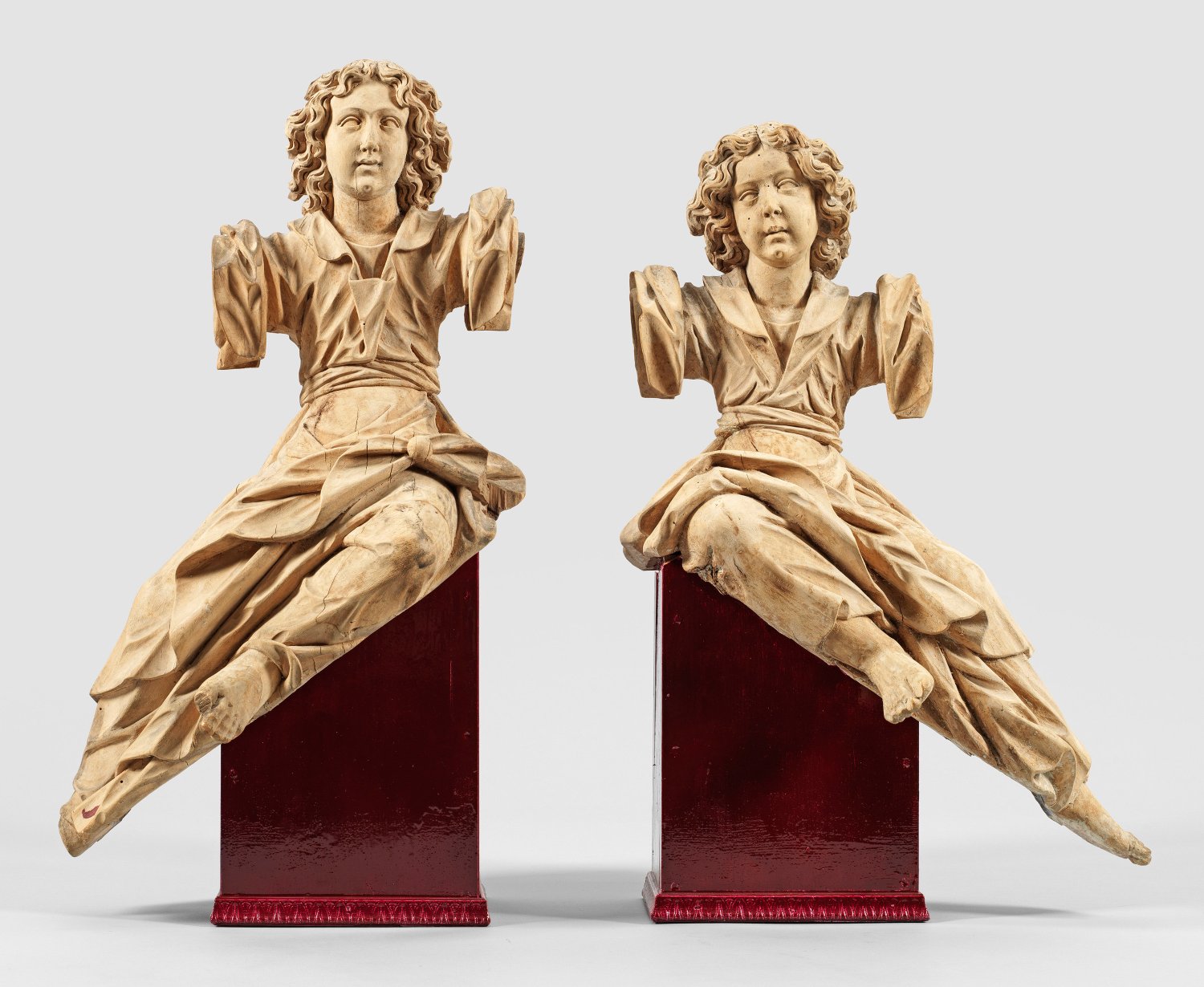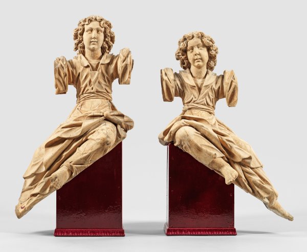 Gegenstücke. Lindenholz, geschnitzt, rücks. ausgehöhlt. Moderne, himbeerrot gefasste Sockel. Seitlich sitzende, sich dem Betrachter zuwendende, jugendliche Engel, die einst mit ausgebreiteten Armen einen Altar oder Tabernakel bekrönten. Die langen, in der Taille gegürteten Gewänder mit reichen Faltenwürfen, die fein geschnitzen, ovalen Köpfe mit schulterlangem, gewelltem Haar und kleinen Mündern, das Kinn bei beiden Engeln spitz zulaufend und mit Grübchen, bei einem der Engel zudem ein durch Wangengrübchen entstehender, subtil lächelnder Ausdruck. Besch.; Skulpturen-H. ca. 58 cm-63 cm.