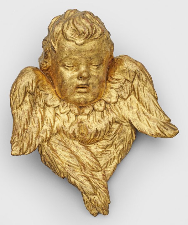 South German Rococo sculptor active ca. 1750. Carved gilded limewood putto head. Minor chipped.