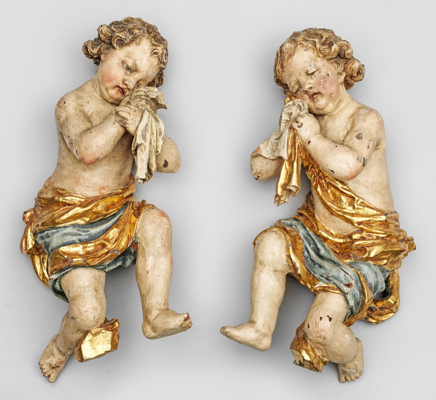 Gegenstücke. Lindenholz, geschnitzt, einige ger. Abplatzungen der übergangenen Fassung und Vergoldung. Annähernd vollplastische, rücks. ausgehöhlte Darstellungen der Putti mit kurzem gelocktem Haar und um die Hüfte und ein Bein geschlungenem Tuch, in trauernder Pose, jeweils nach links bzw. rechts gewandt und hierbei ein Knie aufgestützt. H. ca. 58 cm.
