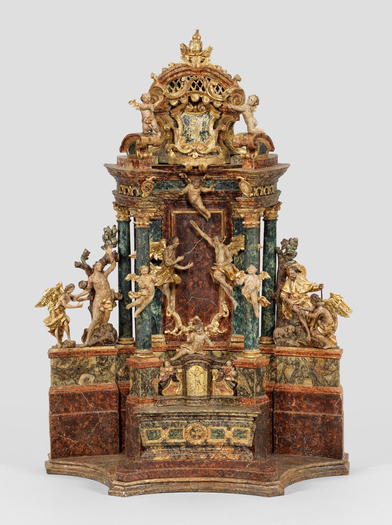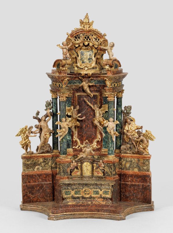 Holz, geschnitzt, farbig gefasst und vergoldet. Architektonisch gestalteter, von korinthischen Säulen und Pilastern gestützter, räumlich zweifach gestaffelter, passig geschweifter, segmentbogenförmiger Altar mit reichem Figurenschmuck. Vorne der dem Gottesdienst dienende Altartisch mit Kreuzigungsrelief, kleinen Engeln und Engelsköpfen; als Verbindung zur hinteren, durch einen Gang beschreitbaren Altarzone zwei von hohen Säulen getragene Architravspangen; die rückwärtige Altarwand flankiert von vollplastischen Darstellungen der Heiligen mit Engeln und Hund als Attribut des Rochus, mittig schwebende Engel, oberhalb ein teilw. durchbrochen gearbeiteter Baldachin mit Krone und Kartusche. Ger. besch.; H. 64 cm.