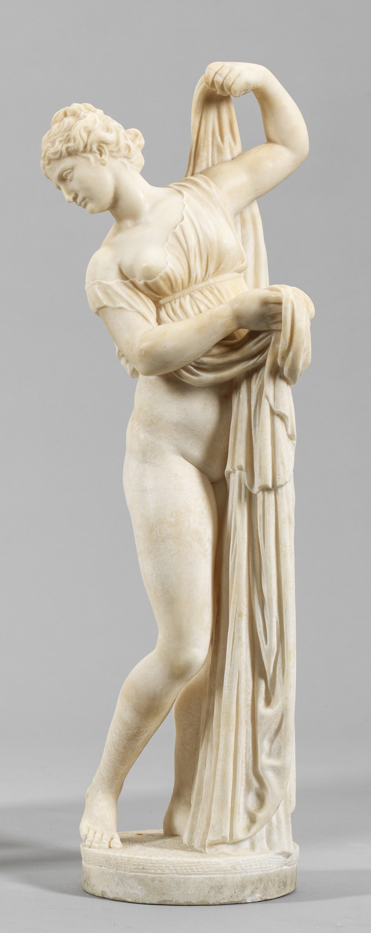 Alabaster. Auf einer runden Plinthe stehende Venus, die ihr Kleid lüpft und über ihre rechte Schulter zu ihrem Gesäß blickt. Fein ausgeführte Statue nach der berühmten römischen Marmorskulptur, die im 16. Jh. in Rom entdeckt wurde und in die Sammlung der Familie Farnese und deren Palazzo in Rom gelangte; seit 1786 in Neapel, heute im dortigen Archäologischen Nationalmuseum. Rest.; H. 63,5 cm.