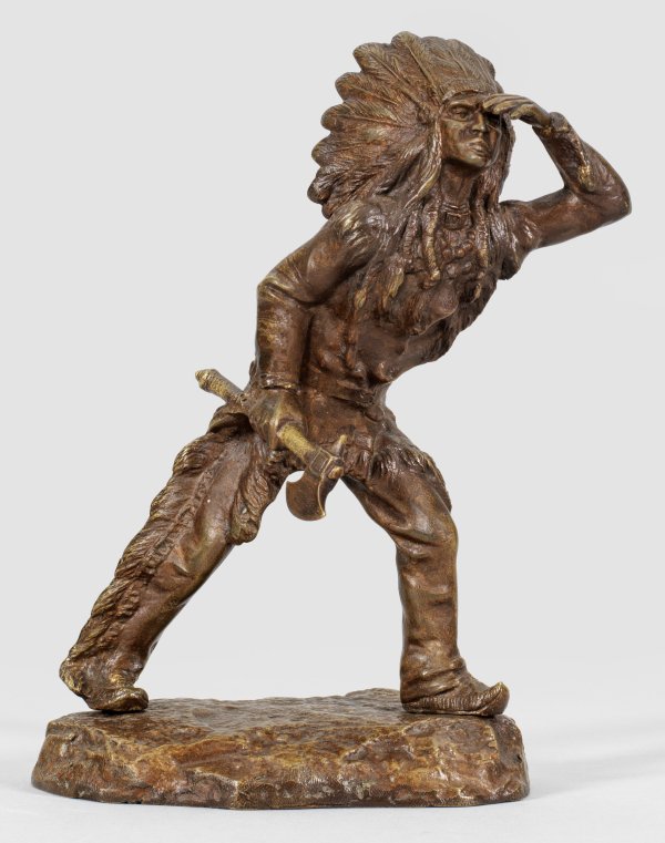 Bronze, braun patiniert. Sign.; Wohl Darstellung eines Lakatoa bzw. Sioux-Häuptlings. Detailreiche Statuette Kaubas, dessen realistisch und lebendig geschilderte Indianer-Figuren unter den "Wiener Bronzen" eine Sonderstellung einnehmen und 1895-1912 vornehmlich für den nordamerikanischen Kunstmarkt gegossen wurden. Für Sammler in den USA gilt Kauba daher neben Remington und Russell als einer der bedeutendsten Bildhauer des Wilden Westens. H. 18,5 cm.