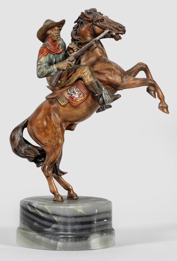 Patiniert und polychrom bemalt; Plinthe aus grauem und grünlichem Onyx. Sog. Krugmarke von Franz Xaver Bergmann. Vollpastische, realistische, lebendige Figurengruppe, der sich zur rechten Seite wendende Cowboy mit einem Gewehr in der einen Hand und festen Zügeln in der anderen. Bronze-H. 17,8 cm; Ges.-H. 22 cm.