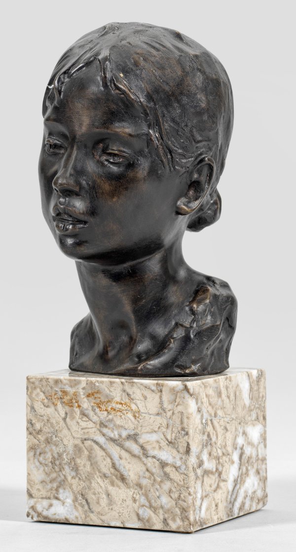 Bronze, dunkel patiniert.; Bez.; Marmorsockel. Posthumer, zeitgenössischer Guss, Ende 20./Anfang 21. Jh.; Der italienische, an der Akademie in Florenz ausgebildete Bildhauer war 1888-1930 in den USA ansässig, wo er zu großer Berühmtheit gelangte und u. a. für das "Marble House" von Alva and William Kissam Vanderbilt tätig war; 1900, 1904 und 1911 gewann Moretti Medaillen auf den Weltausstellungen in Paris, St. Louis und Turin. H. 19,2 cm; Ges.-H. 27,5 cm.