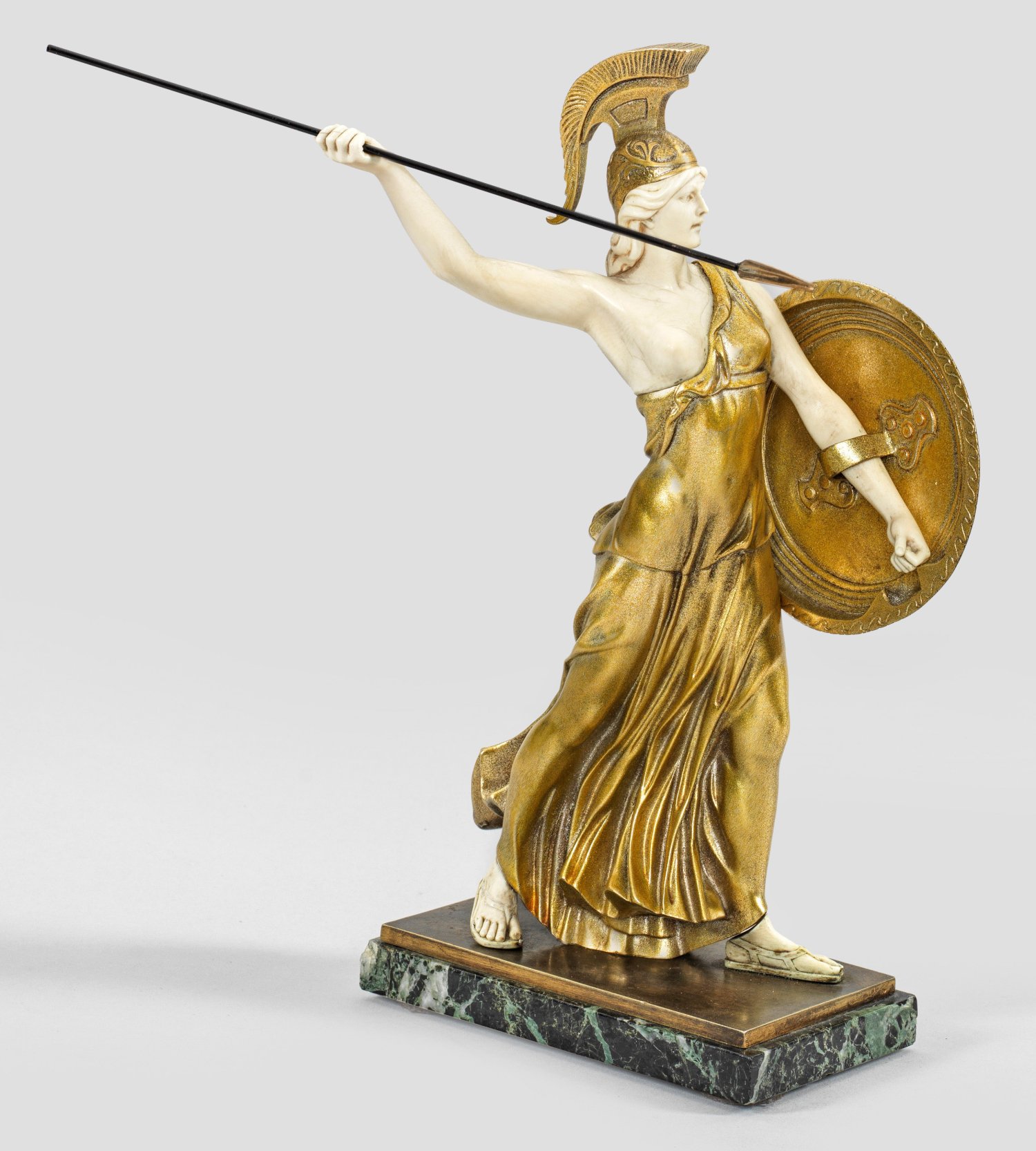 Chryselephantin-Statuette, 1909. Vergoldete Bronze, geschnitztes Elfenbein, Grüner bis schwarzer, geäderter Marmorsockel. Fein ausgeführte Figur des Bildhauers, der seit 1897 an der Kunstakademie studierte und 1903 den Dr. Paul Schulze-Preis der Akademie mit einem Rom-Stipendium erhielt. 1904-1929 war Schultze-Thewis häufig bei den Großen Berliner Kunstausstellungen vertreten, 1909 auch mit einem Exemplar der Bronze "Athena", die von Kaiser Wilhelm II. erworben wurde. Minim. Altersrisse am Elfenbein. Ges.-H. 26 cm.