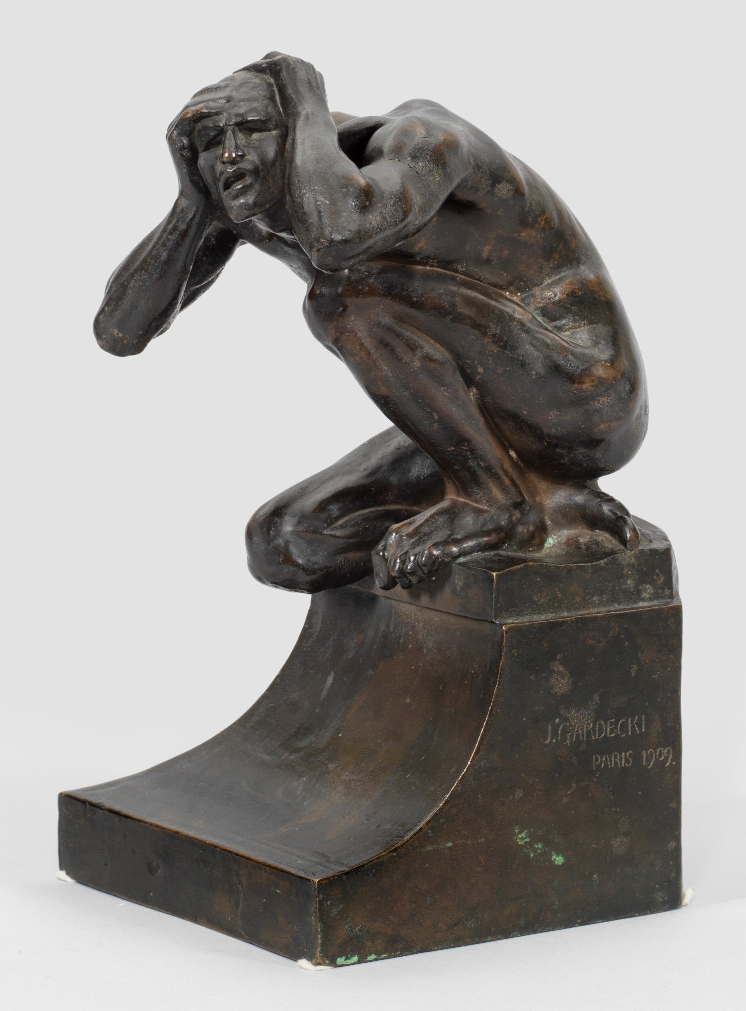 Bronze. dunkel patiniert. Sign. u. dat. 1909 mit Ortsangabe Paris; Gießerstempel "BR. LOPIENSKY WARZAWA". Skulptur "Verzweiflung". Aktfigur eines Mannes in zusammengekauerter Pose mit angewinkeltem linken Bein an der Ecke eines winkeligen Podestsockels kauernd, beide Hände als Ausdruck seiner Verzweiflung fest am Kopf haltend. Seltene Bronze des bedeutenden polnischen Bildhauers, der 1901-1905 an der Akademie in Krakau studierte; 1907-1909 lebte er in Paris, wo er sein Bildhauerstudium bei Auguste Rodin in dessen Atelier in Meudon fortsetzte. 1910-1926 leitete er eine Bildhauerwerkstatt in Warschau, infolge des Warschauer Aufstandes wurde sein Atelier mit einem Großteil seines künstlerischen Schaffens 1944 von den deutschen Besatzern zerstört. H. 27 cm.