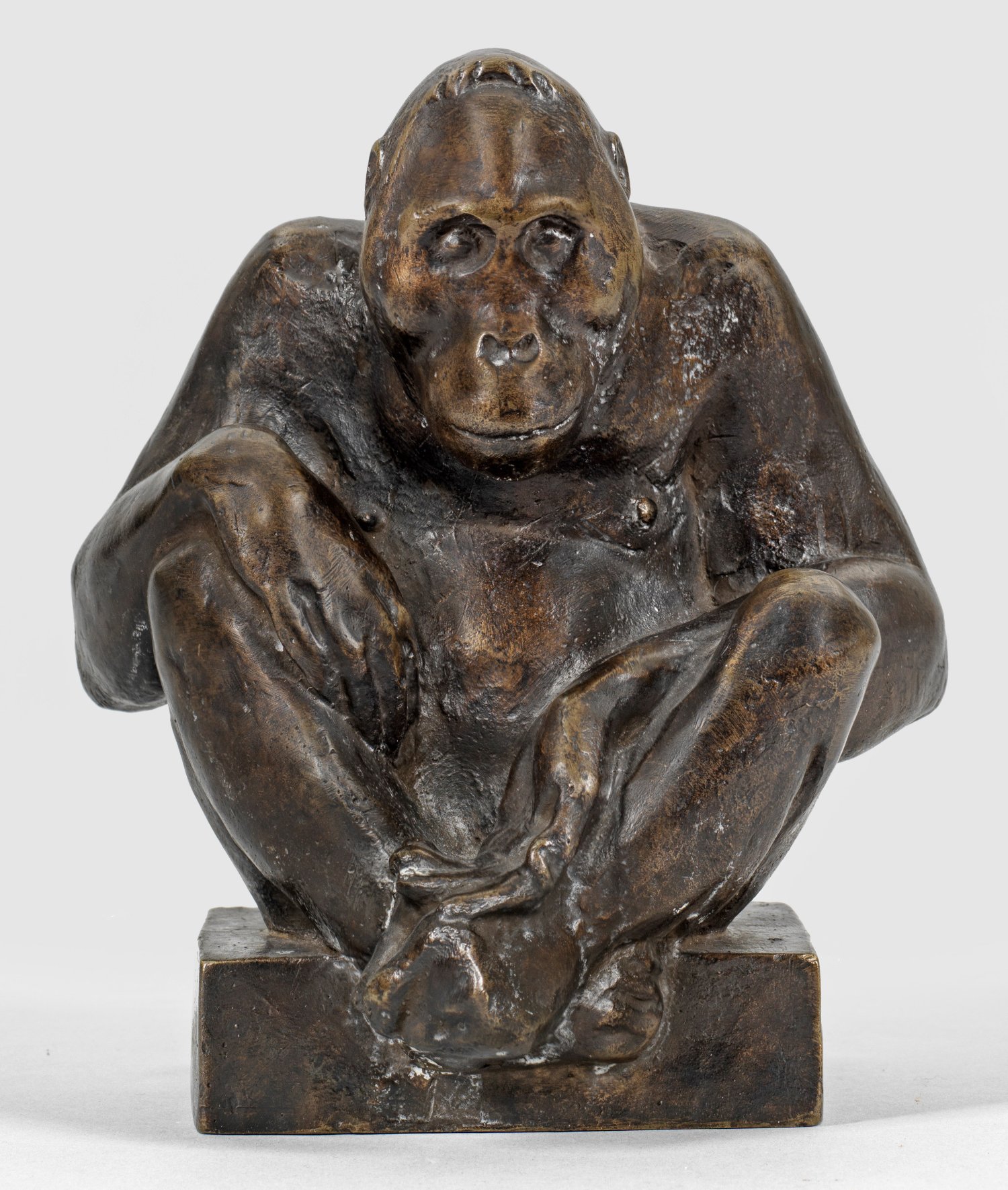 Bronze, dunkelbraun patiniert, 1948. Sign.; Seltener Bronzeguss der Tierfigur, die Scheibe 1948 ursprünglich in Terrakotta als Geschenk für den eng befreundeten Bildhauer Gerhard Marcks modelliert hatte (Exemplar aus dem Besitz von Marcks im Marcks-Haus in Bremen). In einem Brief an Scheibe schreibt Marcks am 18.8.1949: "Aus Köln heimgekehrt finde ich einen Gast in meiner Bude: Deinen Affen. Melancholischer Bote aus Berlin. Ich danke Dir sehr herzlich für diesen Gruß! Du hast diesem gleichmütigen Arbeitslosen tief in die philosophische Seele gesehn". Scheibe befasste sich seit circa 1907/08 immer wieder mit Affen als Motiv für seine Plastiken, sicherlich nicht zuletzt wegen ihrer Verwandtschaft zum Menschen. H. 18,5 cm.