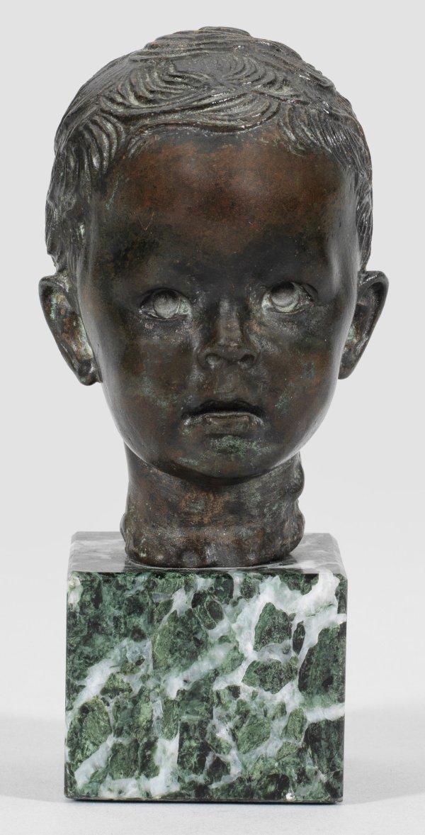 Bronze, dunkeloliv patiniert, um 1956-1962. Am rechten Halsrand sign.; dunkelgrüner, hell geäderter Marmorspockel. Bronze-H. 9,7 cm; Ges.-H. 13,7 cm.