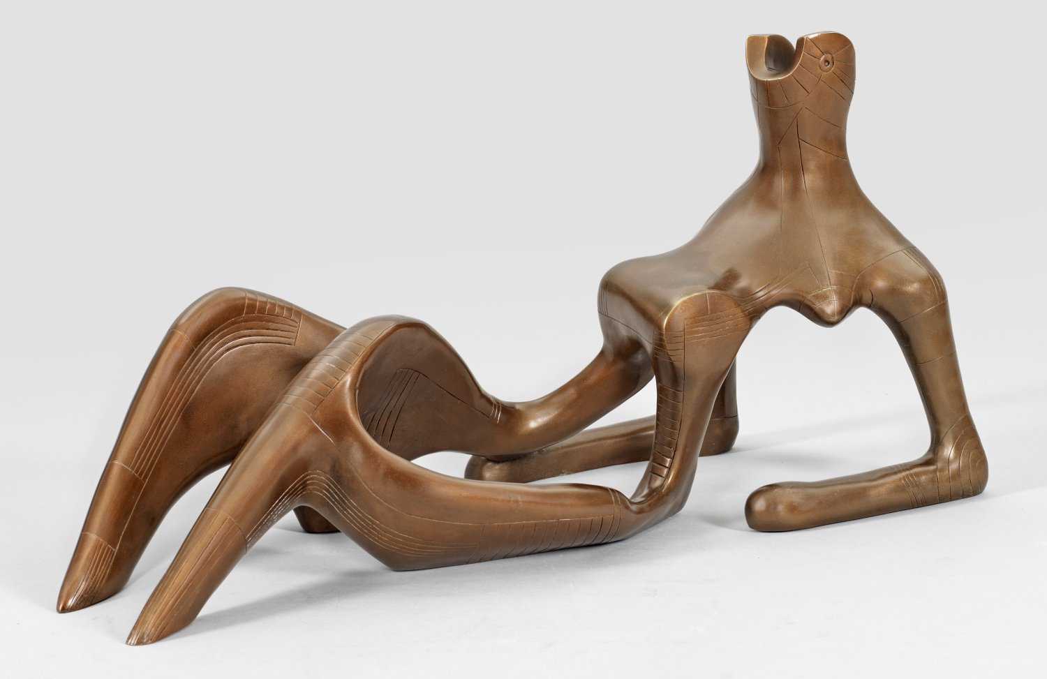 Bronze, braun patiniert. Posthumer, zeitgenössischer Guss (Ende 20./Anfang 21. Jh.) nach der 1950/51 für das "Festival of Britain" entstandenen, berühmten Moore-Plastik. Moore schuf während des Entstehungsprozesses eine Reihe von Modellen und Versionen mit und ohne Plinthe in unterschiedlichen Größen. Originale befinden sich u. a. im Metropolitan Museum in New York, im Jardin des Tuileries in Paris, in der Tate in London und in der Scottish National Gallery of Modern Art in Edinburgh. H. 36 cm; B. ca. 73 cm.