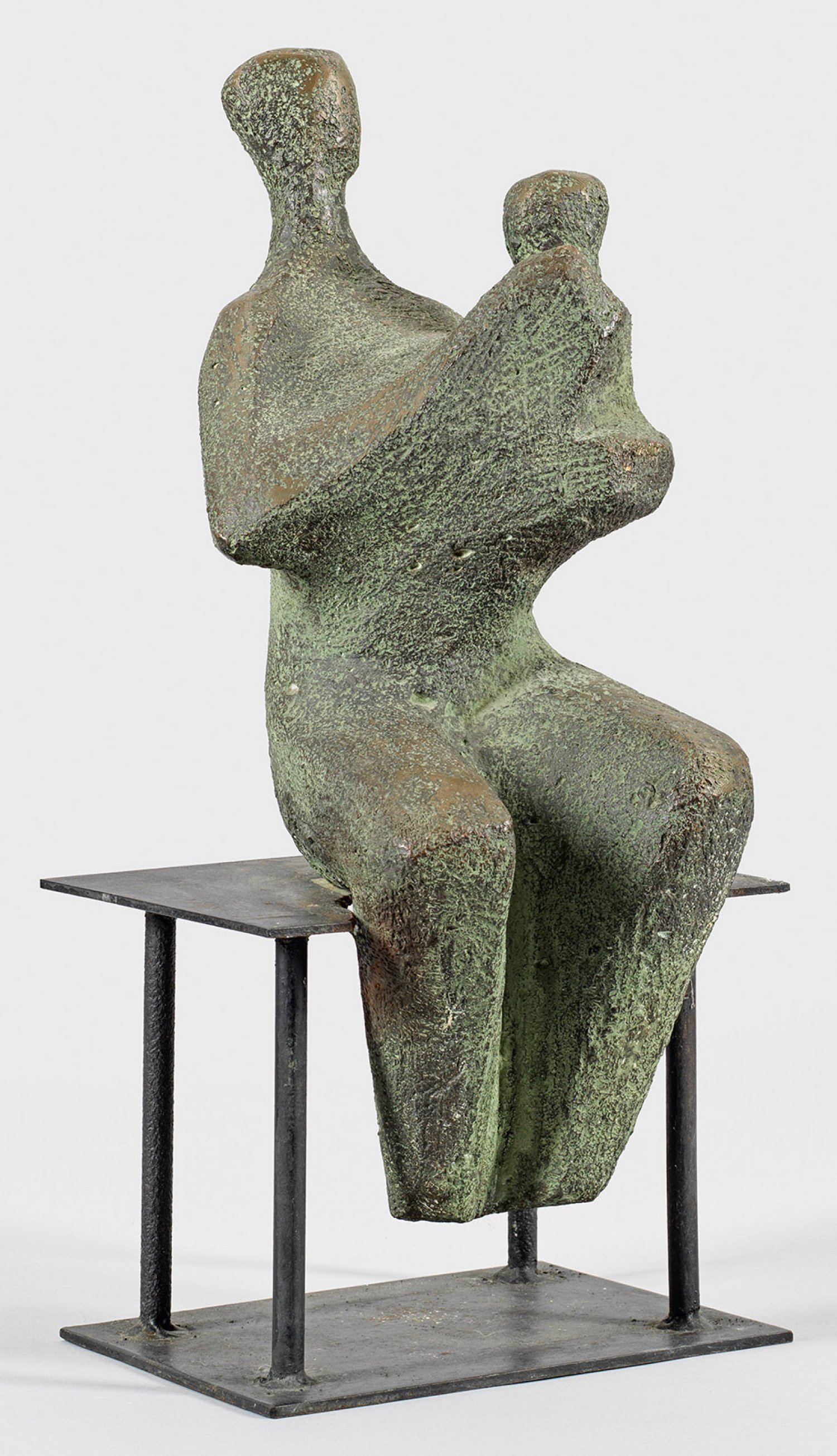 Bronze, patiniert; Bank aus geschwärztem Stahl. Von Henry Moore beeinflusste, wohl in den 1950er Jahren entstandene Plastik. Ges.-H. 52 cm.