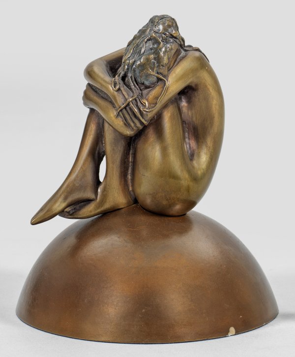 2-tlg.; Bronze, goldbraun bis dunkelbraun patiniert, 2004; Sockel aus Polymer-Guss mit gebundener Bronze-Oberfläche, 2004. Sign.; nummeriert "204/5000", Gießerstempel von ARA-Kunst, Dr. Fritz Albrecht, Altrandsberg. Am Sockelrand minim. best.; Ges.-H. 17,8 cm.