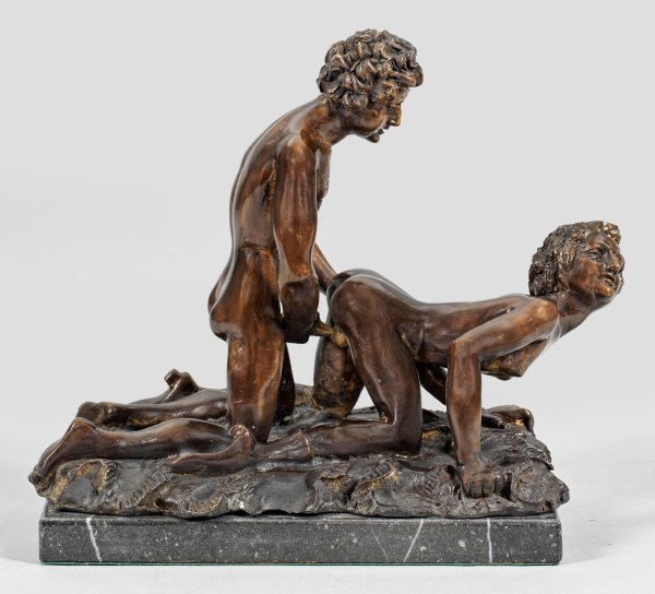 Metallguss, dunkelbraun patiniert. Pseudo-Sign.; Schwarzer, hell geäderter Marmorsockel. Vollplastische Darstellung eines Paares in erotischer Pose beim Liebesakt a tergo. Ges.-H. 21,5 cm.