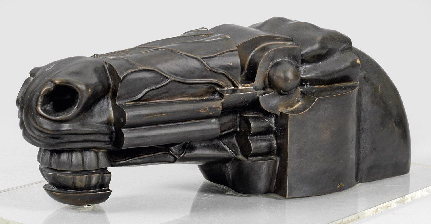 Bronze, dunkelbraun patiniert, 1991. Sign. u. dat.; Montiert auf einer Acrylglasplatte. Vollplastische, vom Kubismus und Surrealismus beeinflusste Darstellung eines Pferdekopfes. Kirov studierte an der Kunstakademie in Sofia und stellte seit 1985 aus, zunächst in Bulgarien, seit 1989 auch international. Bronze ca. 57 cm x 21,5 cm x 17,5 cm.