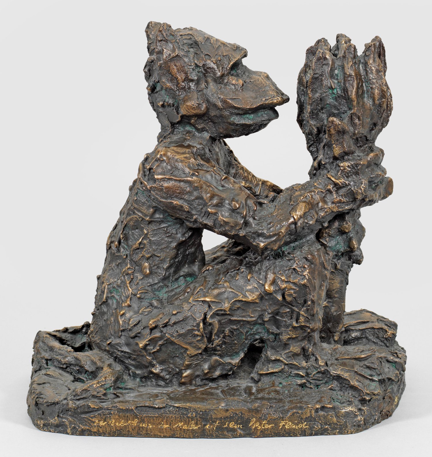 Bronze, braun patiniert, partiell poliert, 1995. Sign., dat., nummeriert 23/980; Gießerstempel, Guss ARA Kunst, Dr. Fritz Albrecht, Altrandsberg. Exemplar aus einer Sonder-Edition in einer 10er-Auflage mit brauner Patinierung (innerhalb der 980er Nummerierung) als ungeteilte Bronze-Plastik, Guss 2007. An der Plinthe Inschrift "Der Bildhauer im Maler ist sein bester Feind". Vollplastische, expressive Darstellung eines sitzenden Affen, einen überdimensionalen Pinsel haltend und anschauend, die Oberfläche in lebendig reliefierter Textur durch die roh belassenen Tonklumpen des Modells. Für Immendorff, der die deutsche Kunst seit den 1970er Jahren prägte, war der Affe das Sinn- oder Ebenbild des Malers, quasi sein "Alter Ego". Der "Maleraffe" wurde daher ein immer wiederkehrendes Motiv im gesamten Oeuvre Immendorffs. In einer großen Plastik von 2002 hat er sich sogar selbst als Maleraffe an der Hand von Joseph Beuys dargestellt, denn er studierte in den 1960er Jahren bei ihm an der Düsseldorfer Akademie. 1989 erhielt er eine Professur an der Städelschule in Frankfurt am Main, ab 1996 war er Professor an der Kunstakademie Düsseldorf. Ca. 38 cm x 38 cm x 26 cm.